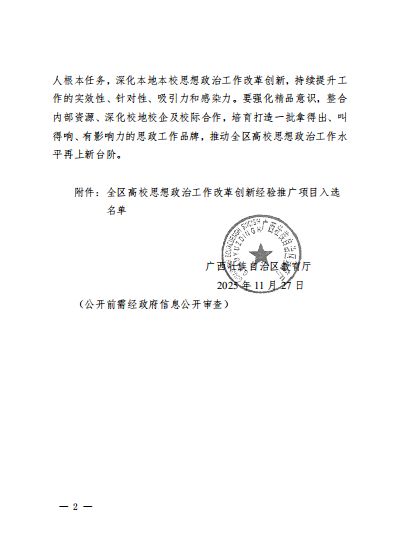 近日,自治区教育厅公布了全区高校思想政治工作改革创新经验推广项目入选名单。我校共有 4 个项目荣登榜单。钟华主持的《以提升全民国防素养为导向的“三育三促 ”高校国防教育模式探索与实践》入选高校思想政治工作创新项目,高崧耀主持的《“ 四维协同 · 五育融通 ”视域下红色文化育人体系的构建与实践》、毛小玲主持的《车祸后的心理重生——基于整合性艺术治疗的干预》、雷湘竹主持的《共联·共研·共生:“大中小学思政课一体化共铸中华民族共同体意识 ”实践案例》项目入选高校思想政治工作创新案例。